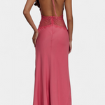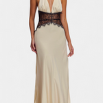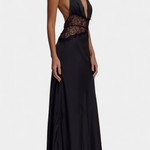 Dizajn koji isijava rafiniranu senzualnost i sofisticiranu eleganciju. Martina kombinira duboki halter izrez s delikatnom čipkastom trakom na struku, stvarajući savršeni kontrast između suptilnog i odvažnog. Fluidna tkanina obavija tijelo s gracioznošću, dok potpuno otkrivena leđa dodaju neočekivani i odvažni zaokret.